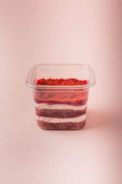 Состав: Классический бисквит красный бархат , пропитанный сиропом , с начинкой из кремчиза и прослойкой вишневого конфи из натуральных ягод.