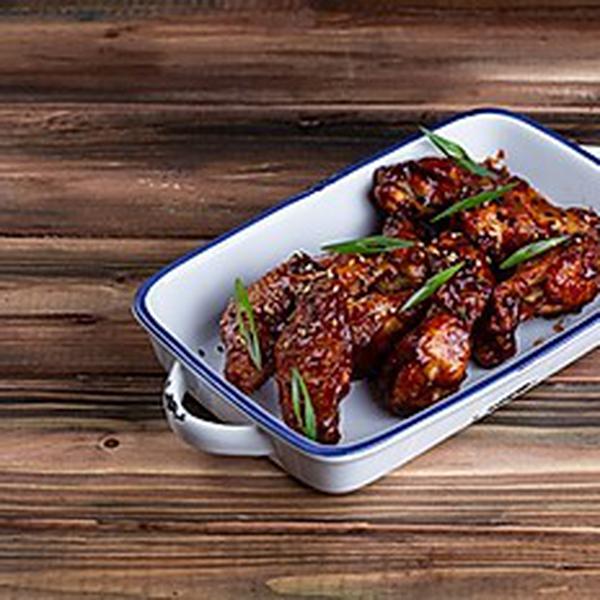 Состав: Куриные крылышки, соус BBQ, зеленый лук, кунжут.