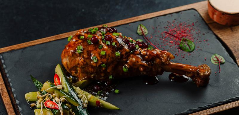 Состав: Голень индейки, салат из битых огурцов, соус кимчи.