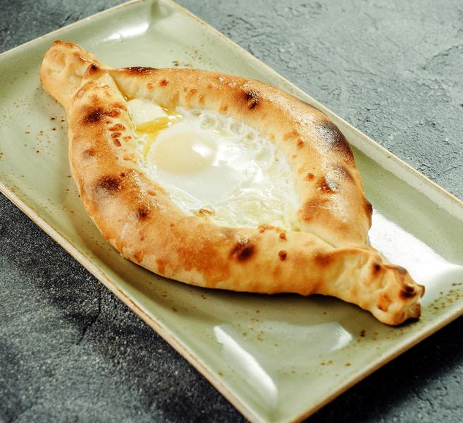 Состав: Открытый пирог с сыром сулугуни и запеченным яйцом с маслом.