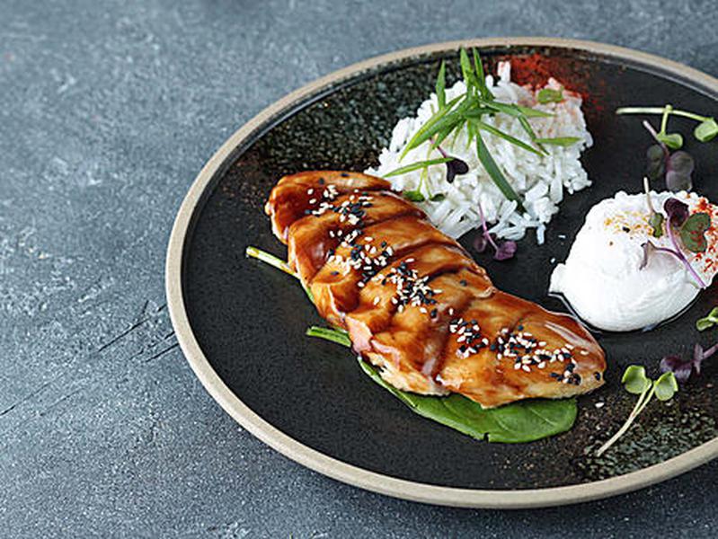 Состав: Куриная грудка, соус терияки, яйцо пашот, отварной рис басмати, шпинат, зеленый лук, кунжут.
