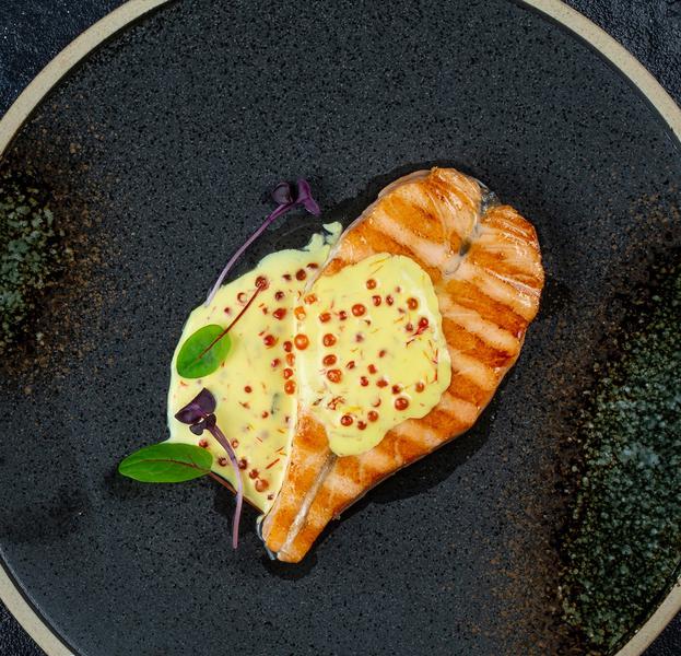Состав: Филе лосося на гриле, шафран, красная икра, сливки.