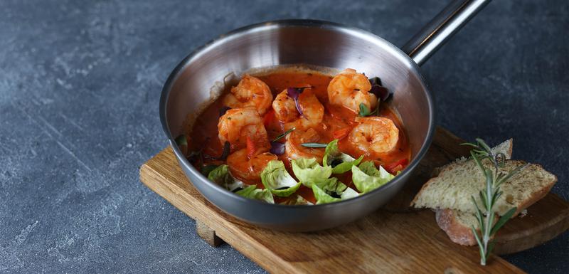 Состав: Тигровые креветки, цукини, болгарский перец, шпинат, сливки, соус гаспачо.