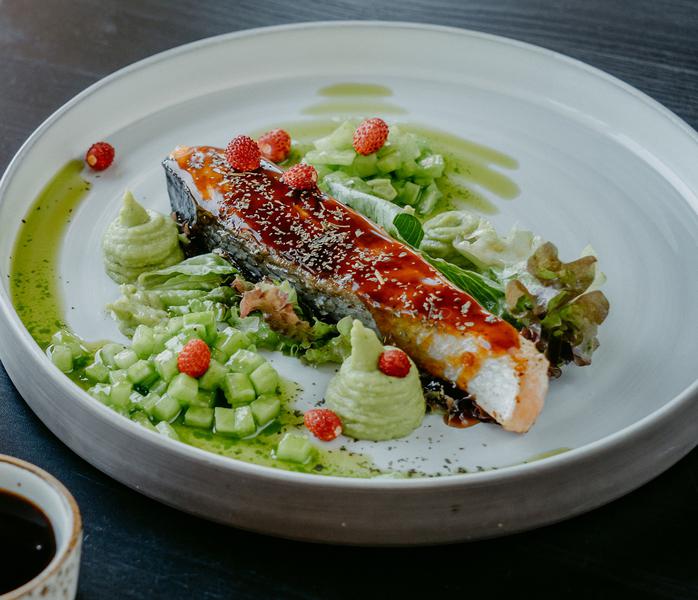 Состав: Филе семги, брокколи, огурцы, ягода, салат микс, терияки, прованские травы, мед, оливки, масло зеленое.