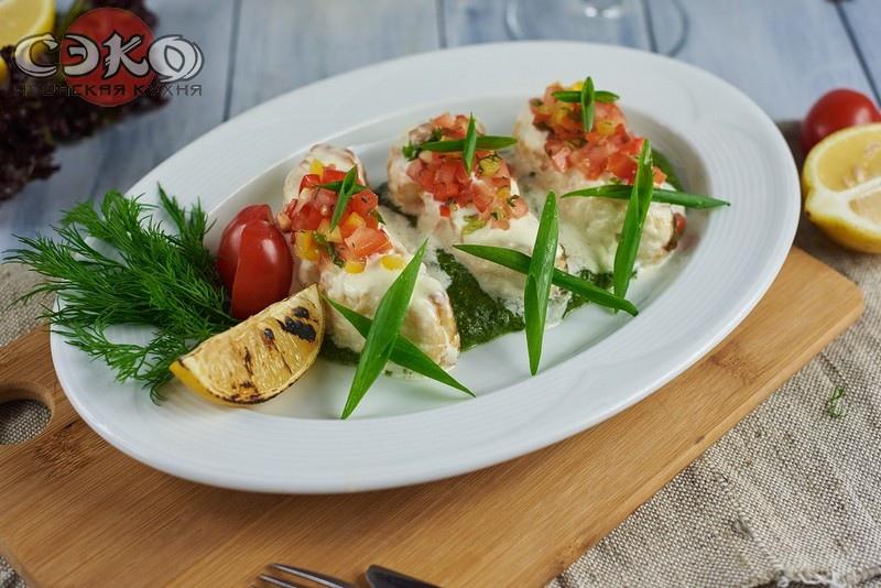 Состав: Филе судака, шпинат, кинза, чеснок, перец болгарский, томаты, лимон