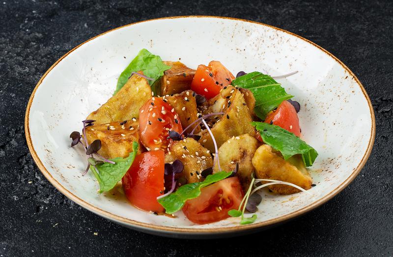 Состав: Баклажаны, томаты, салат романо, соус азиатский.