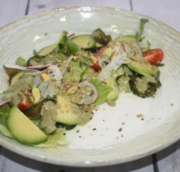 Состав: Салат микс, редис, томаты черри, авокадо ,огурцы, соус фисташковый, фисташки