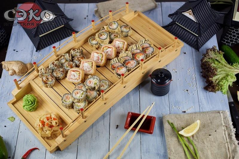 Состав: Ролл сяке темпура маки, ролл калифорния темпура маки, ролл сяке кунсей темпура маки, ролл тори темпура, ролл сяке темпура маки