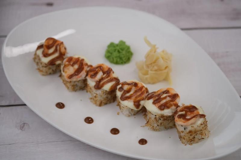Состав: Лосось, креветки тигровые, огурец, стружка тунца, сыр Филадельфия, соус унаги карамель