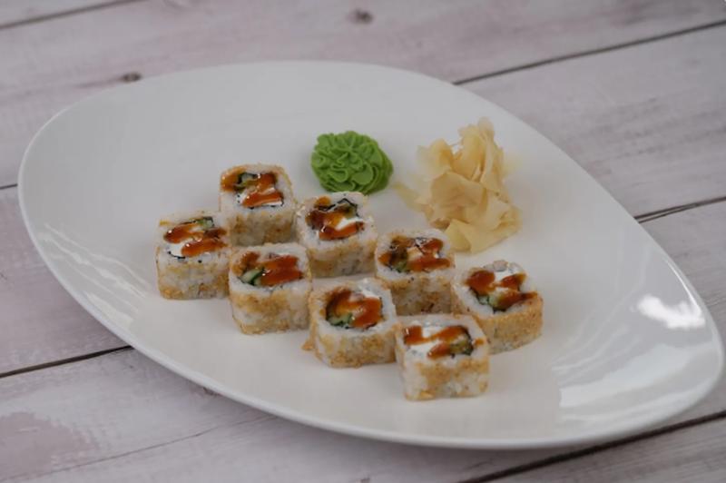 Состав: Морской окунь, огурцы, сыр филадельфия, ореховая посыпка, соус унаги карамель