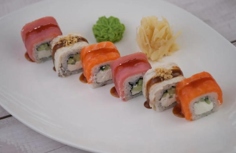 Состав: Тунец, лосось, угорь, огурец, сыр филадельфия, соу манго чили