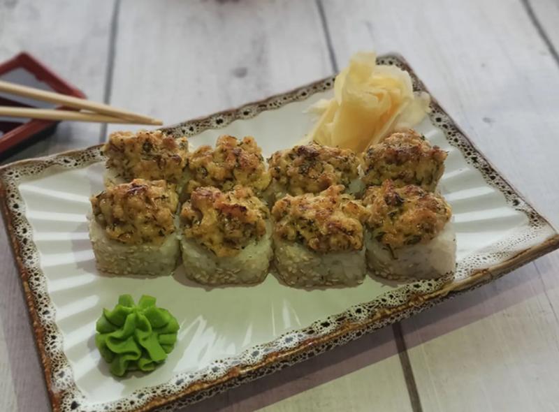 Состав: Сыр филадельфия, куриное бедро, омлет, укроп, соус сырный, икра летучей рыбы