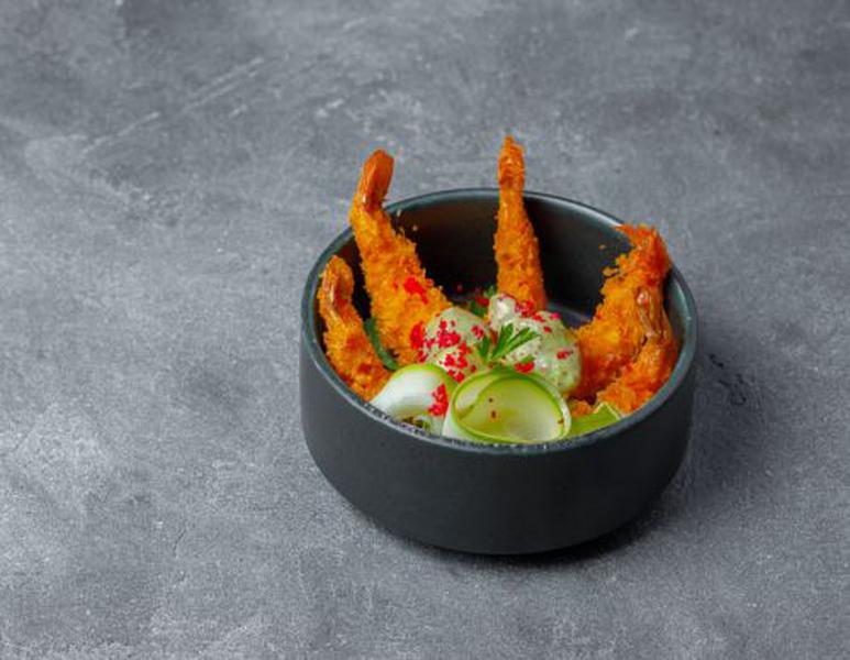 Состав: Тигровые креветки, темпера, соус васаби, шпинат, цукини, тобико