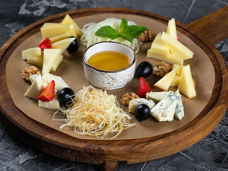 Состав: Пармезан, моцарелла, сулугуни копченый, адыгейский, сулугуни, дорблю, сыр молочный чечил, сыр копченый чечил.